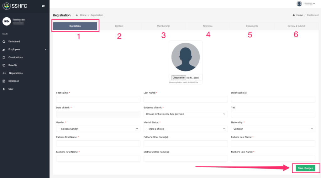 Step 4: You will need to provide 5 categories of information about the employee in each tab: Bio-Details, Contact, Membership, Nominee, and Document. After filling in the form for each category, click on the “Save Changes” button to save the information entered.
