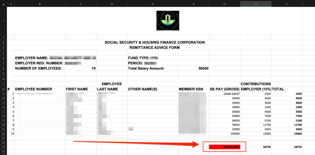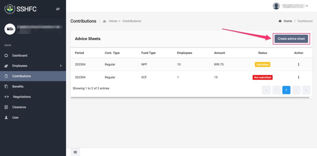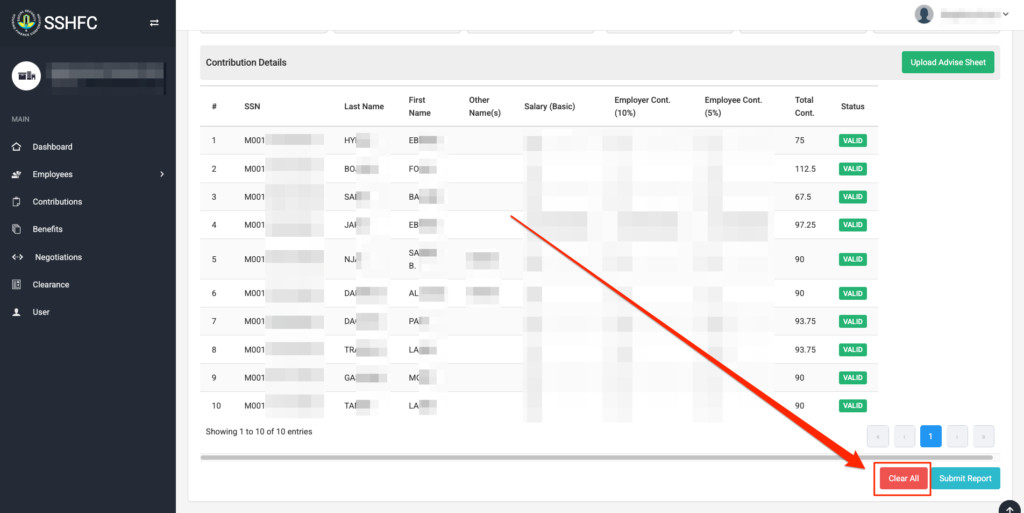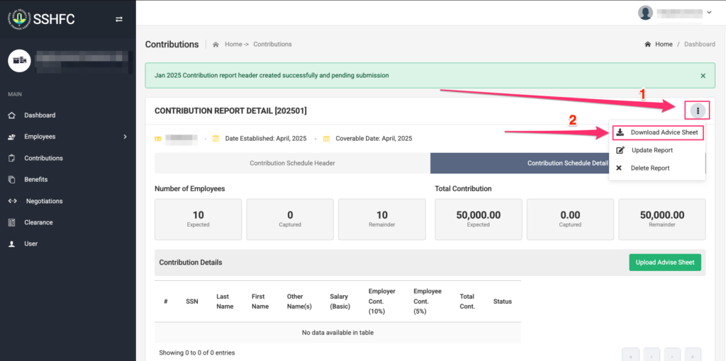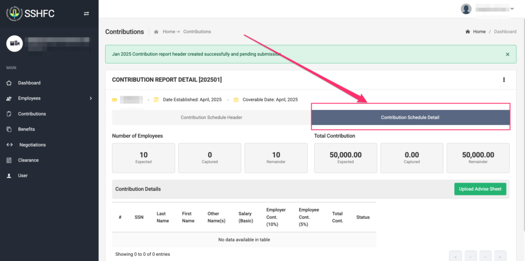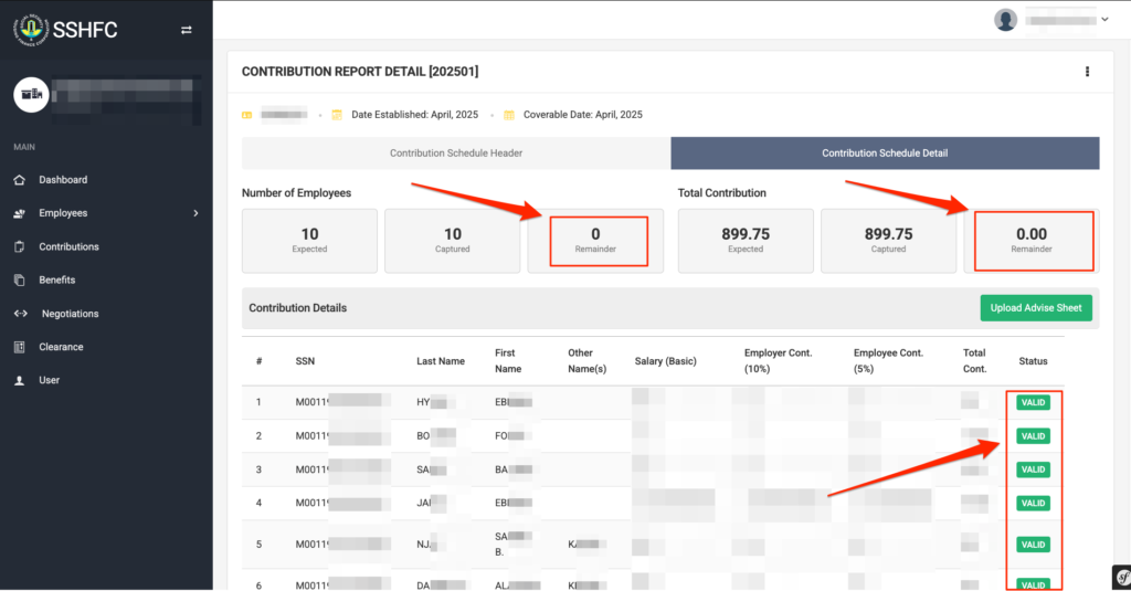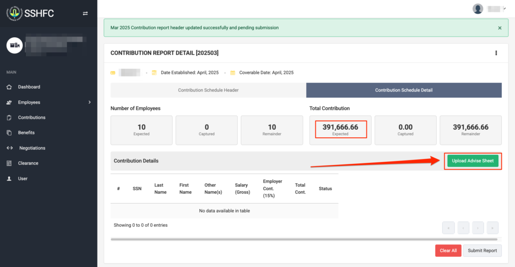 Once the Excel sheet value matches the total salary (Expected Total Contribution) and saved, click “Upload Advice Sheet” to upload it back into the system.