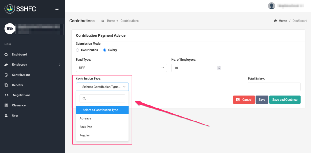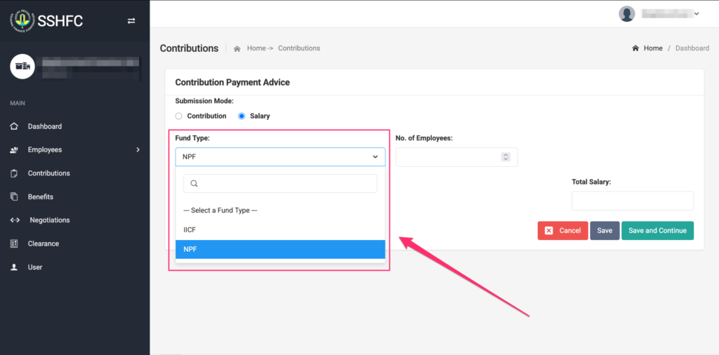 Select the appropriate fund type from the available options based on your organization’s contribution scheme.